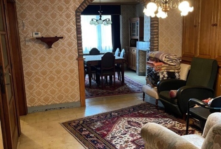 Charmante woning met tuin op wandelafstand van het centrum. Indeling gelijkvloers: Inkomhal ca 8 m2 met plafond met moluren en houten trap naar verdieping. Gezellige living ca 30m2: zithoek op parketvloer met ...